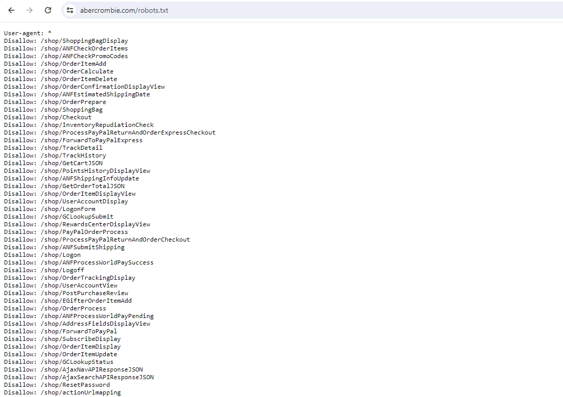 In theory, this data could be collected using traditional scraping methods, but there would be several obstacles. First, upon inspecting abercrombie.com/robots.txt file, we would notice that a significant portion of the website is restricted from automated access:
