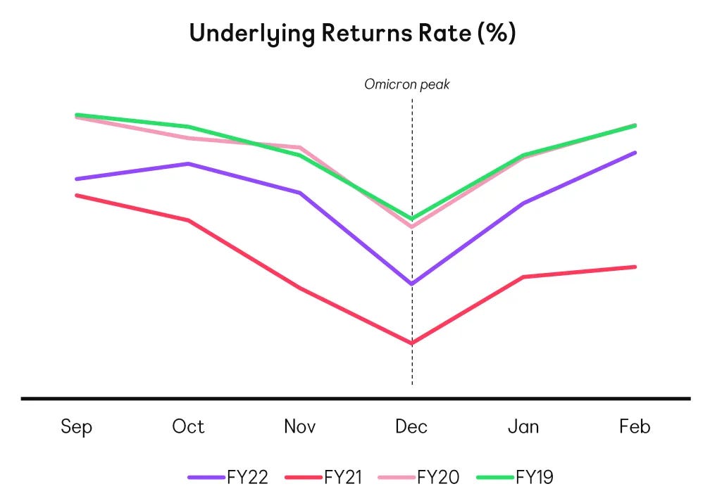One issue with tracking returns rates is that they are inherently lagging indicators. Products purchased during high-sales periods like November's Black Friday are often not returned until late December. Calculating the ratio of purchases to returns within the same month could misleadingly depict a low return rate in November and an anomalously high rate in December. However, this doesn't accurately reflect the underlying returns rate—defined as the percentage of orders made within a specific period that are eventually returned.