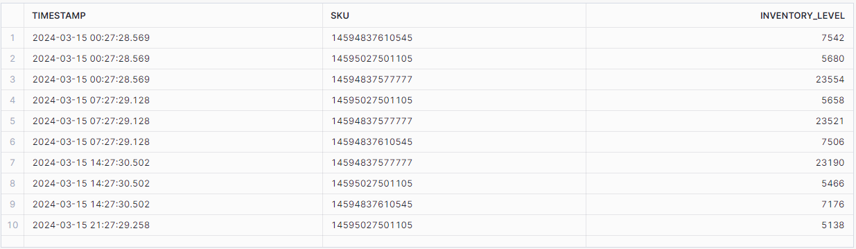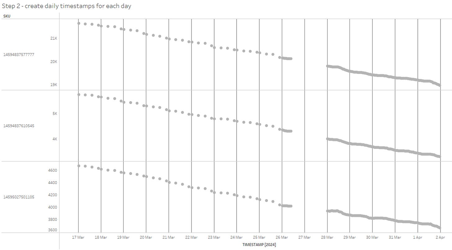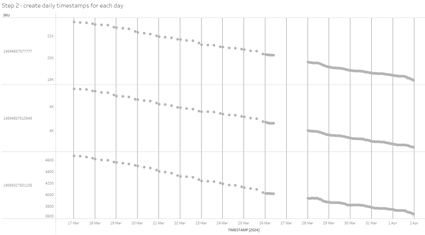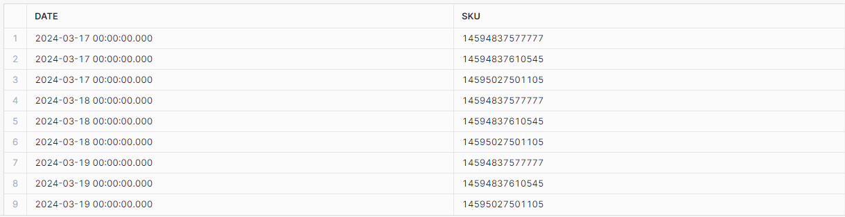 This CTE generates midnight timestamps for each day within our specified time range and for each SKU present in our source data. Importantly, it also includes the days for which data is missing from the source, such as March 27th: