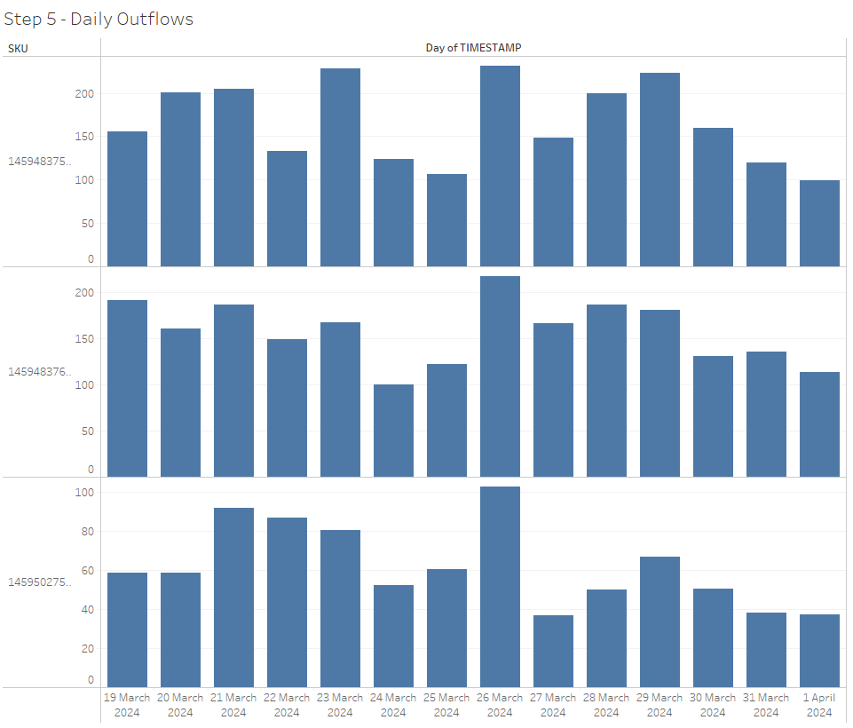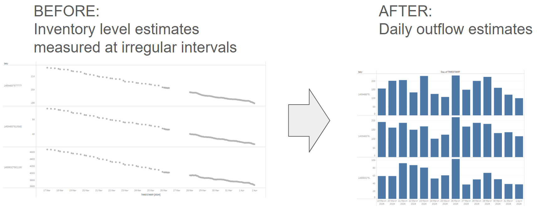 This process transforms the original, messily collected, irregular inventory level data into clean, daily stock outflows: