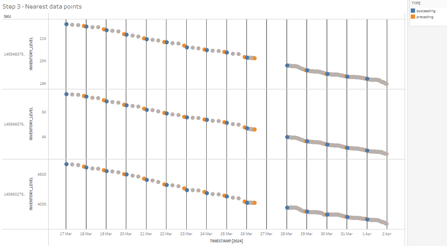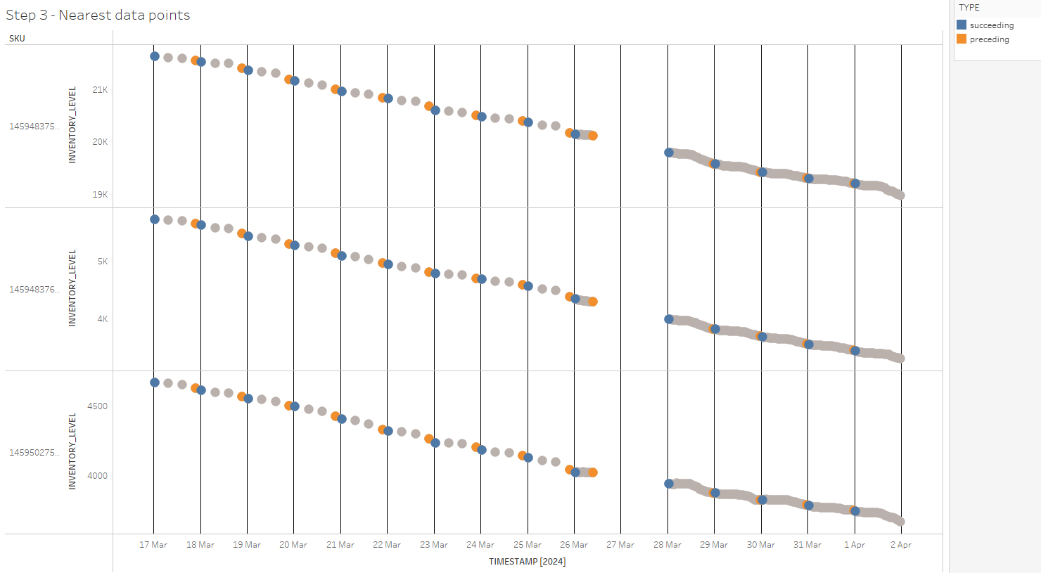 The next step involves identifying two observations of inventory levels from the source dataset that are closest to each midnight timestamp—one before and one after midnight.