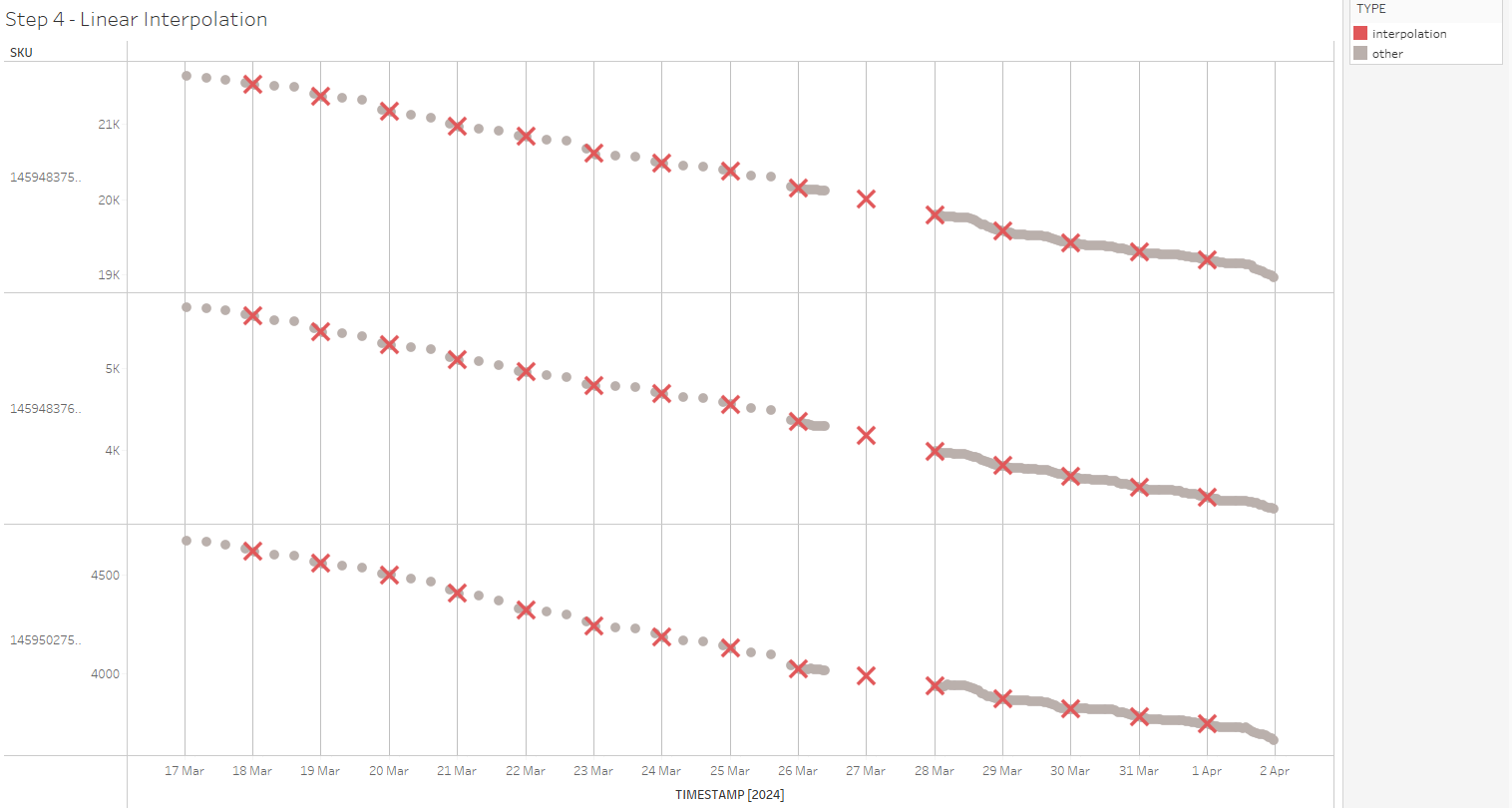 This is the overall result of this step; we now have interpolated daily values for each SKU and for each day:
