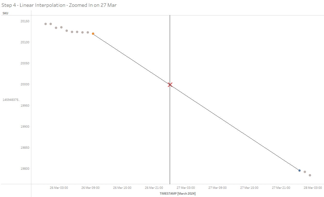 Let’s zoom in on a specific instance: 27 May at 00:00, for one particular SKU, to see what exactly occurs during this step. With linear interpolation, we essentially connect the nearest preceding and succeeding observations with a straight line. We then determine the point where this line intersects with the timestamp of interest (midnight in our case). This process helps us estimate the precise value at this specific moment.