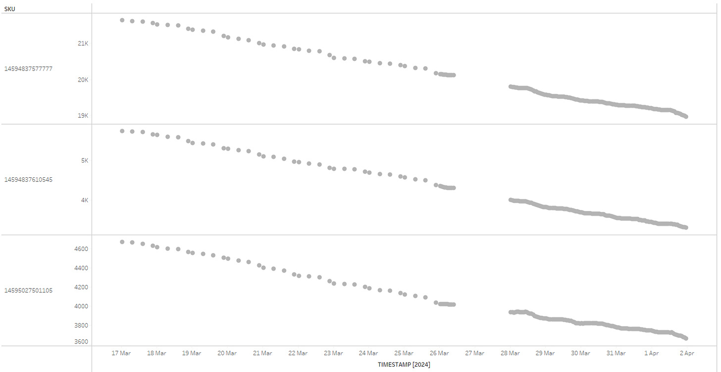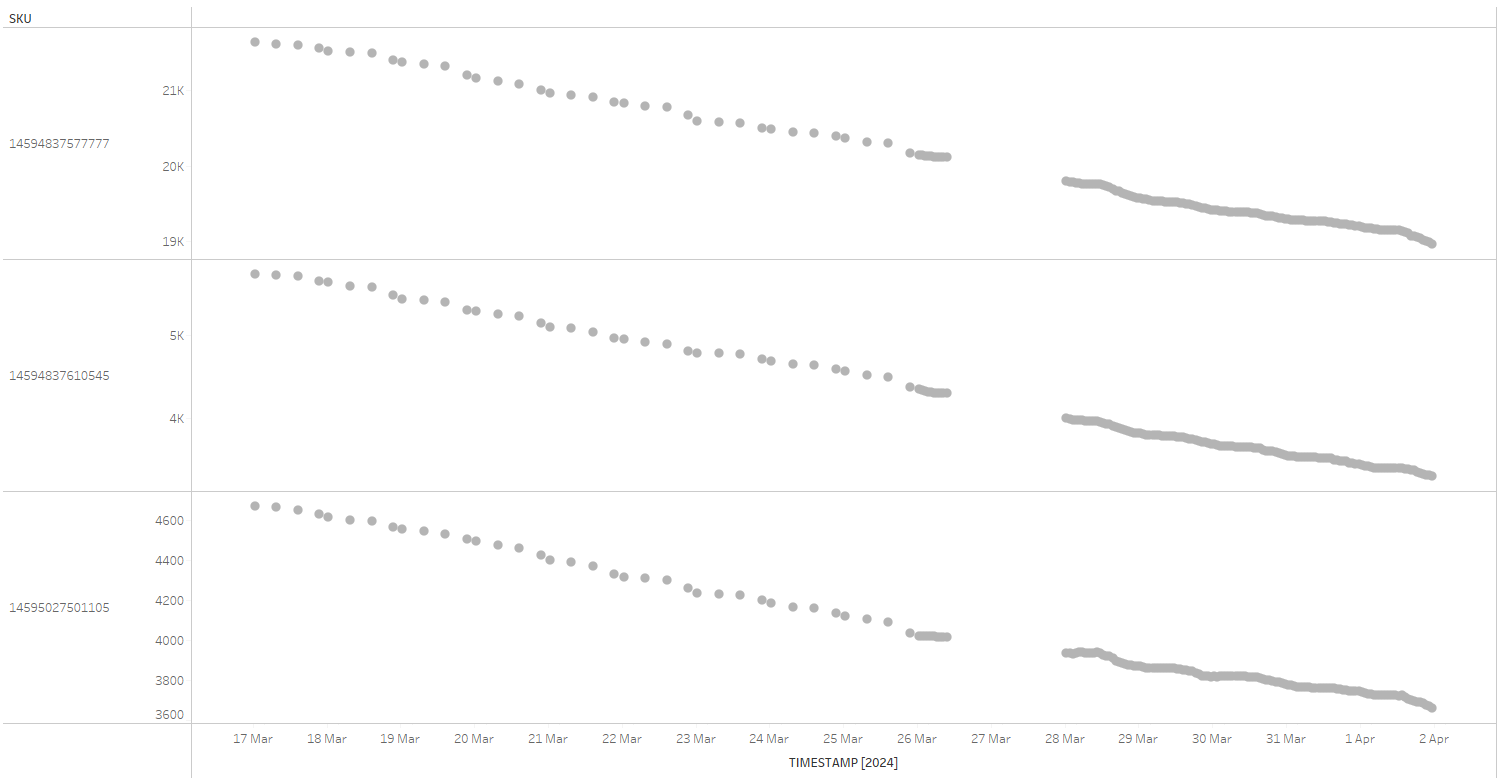 Imagine we are continuously collecting SKU inventory levels through a scheduled process. Generally, it is better to collect data more frequently, but more frequent data collection has highler collection costs. In some situations the frequency might change over time — we might start collecting data daily and if we find some value, we can increase frequency to get more accurate data. Moreover, when it comes to web scraping, it is not uncommon to have some missing data. Even with the best setup and expertise, many factors are beyond our control, and it always takes time to restore normal operations when something breaks. As far as I know, no one can offer real Service Level Agreements (SLAs) for collecting data from third-party websites. This means we often have to handle some missing data at the data analysis stage, which makes the process of transitioning from collecting inventory levels to measuring daily stock outflows somewhat complex.